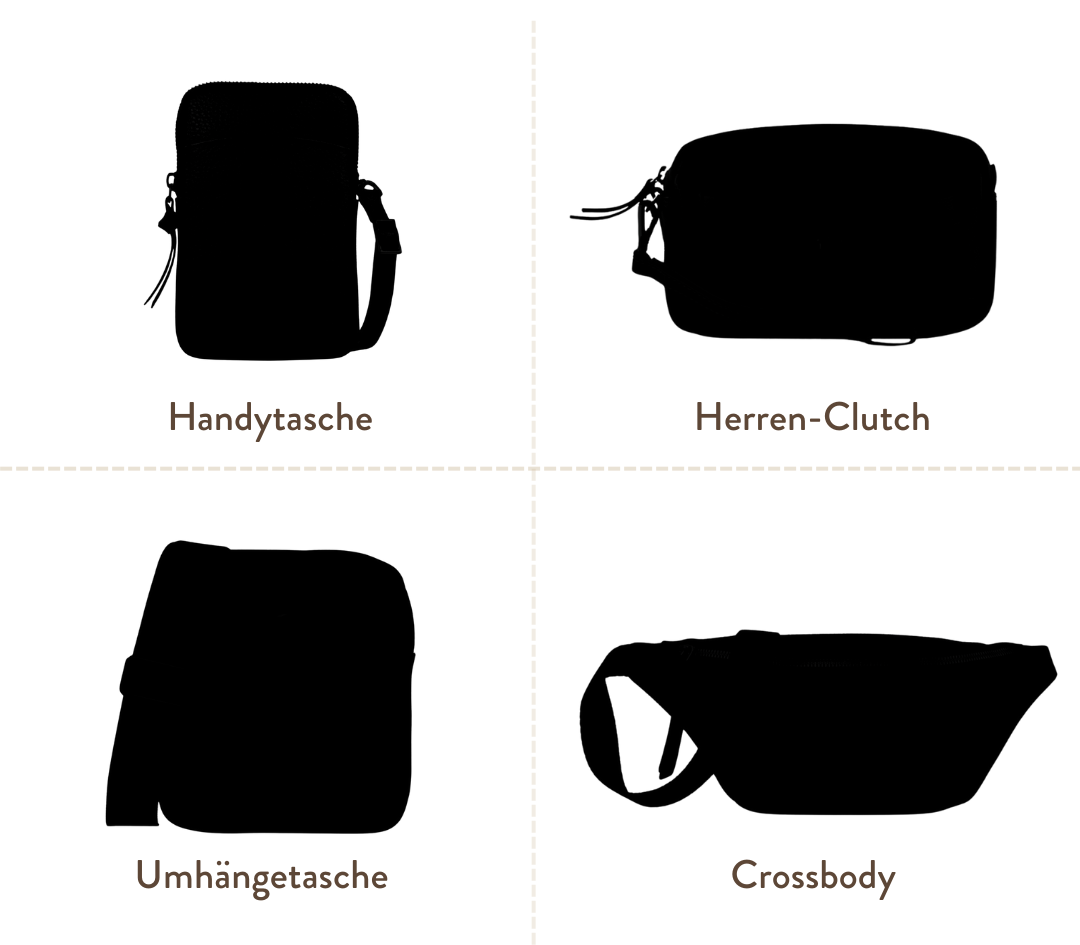 Hochzeiten eine große Auswahl an stilvollen Handtaschenmodellen, die Eleganz und Funktion perfekt verbinden. Besonders beliebt sind Umhängetaschen in verschiedenen Größen, denn sie lassen sich bequem tragen und wirken zugleich modern und festlich. Wer nur das Wichtigste wie Handy, Ausweis und Taschentuch dabeihaben möchte, greift zu einer kleinen Handytasche: Phone Bags sind leicht, unauffällig und perfekt für minimalistische Hochzeitsoutfits. Für einen besonders modischen Akzent sorgen Moonbags, die mit ihrer runden Form modern und edel wirken. Ein weiterer Hingucker ist die BoxBag: kantig, kompakt und zeitgemäß – sie verleiht jedem Outfit eine cleane, stylishe Note. Ebenso stilvoll sind schicke Envelopebags oder Clutches, die flach, edel und perfekt für Abend- und Cocktailkleider geeignet sind. Wer etwas mehr Platz benötigt, wählt eine größere Umhängetasche oder eine sanft fallende Handtasche – lässig, groß genug für viele Essentials, aber dennoch elegant genug für eine Hochzeit.