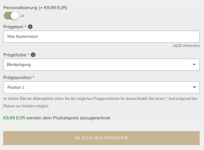 You can now add the details for your personalization directly on the item page. Some fields, such as the embossing position or the embossing color, can be selected using predefined values in a dropdown menu. The embossed text is limited to a number of characters.