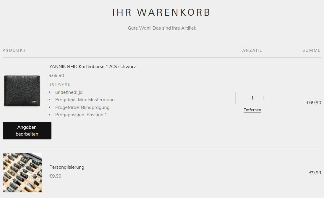 When you have finished shopping, you can see all the items in your shopping cart again. Your desired personalized products are marked separately. Please check all the details again in this step. Personalized leather goods are excluded from the right of return!