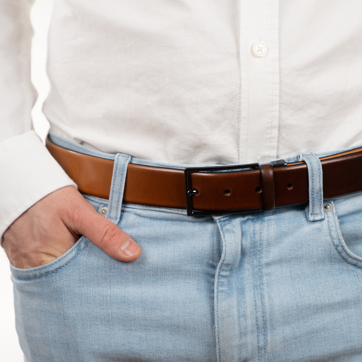 The CARLO men's belt, crafted from vegetable-tanned Italian cowhide, is available in two warm brown tones with a subtle gradient. The delicate, dark-gloss pin buckle and lightly polished natural surface give it a modern, elegant look. The length can be adjusted to your liking.